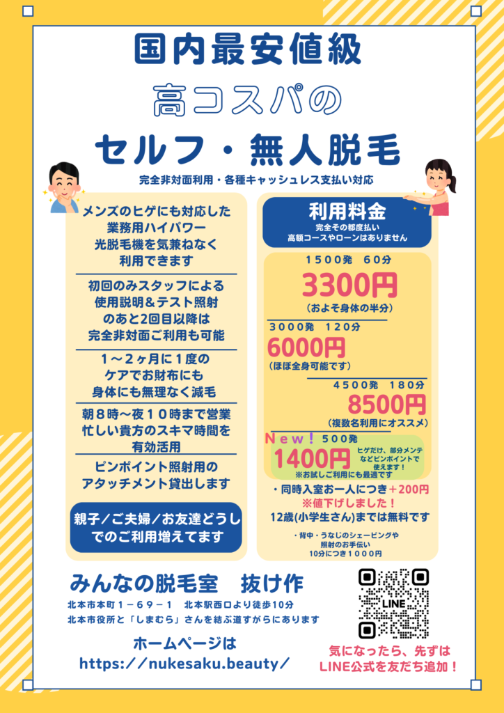 - メンズのヒゲにも効果のある業務用ハイパワー脱毛機をご自身のペースで気兼ねなく使えます
