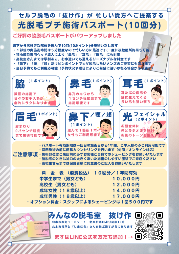- 鼻毛/眉毛/耳毛などセルフでは難しい狭小部位には「プチ施術10回パスポート」でスタッフが施術いたします